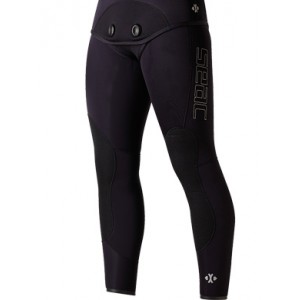 Pantalon salopette 5 mm. Doublure extérieure : Nylon super-élastique Extraflex de dernière génération. Doublure intérieure : “CELL” ouvert coupé lisse. Coutures extérieures : type “à point invisible” à double fil.