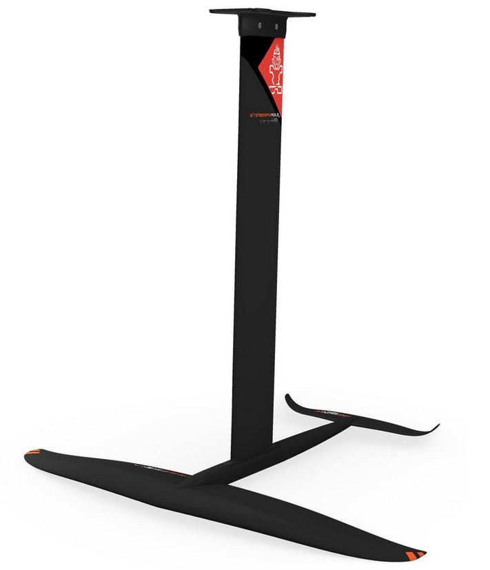 Le fuselage et le mât sont réalisés en aluminium UCS (Universal Connect System), garantissant un excellent rapport rigidité/poids. Ce matériau rend le foil à la fois résistant et accessible en termes de coût. L’aile avant E-Type de 1400 cm², avec son profil porteur, génère une très bonne sustentation sans exiger de vitesse excessive. L’aile arrière stabilisatrice complète l’ensemble avec équilibre.